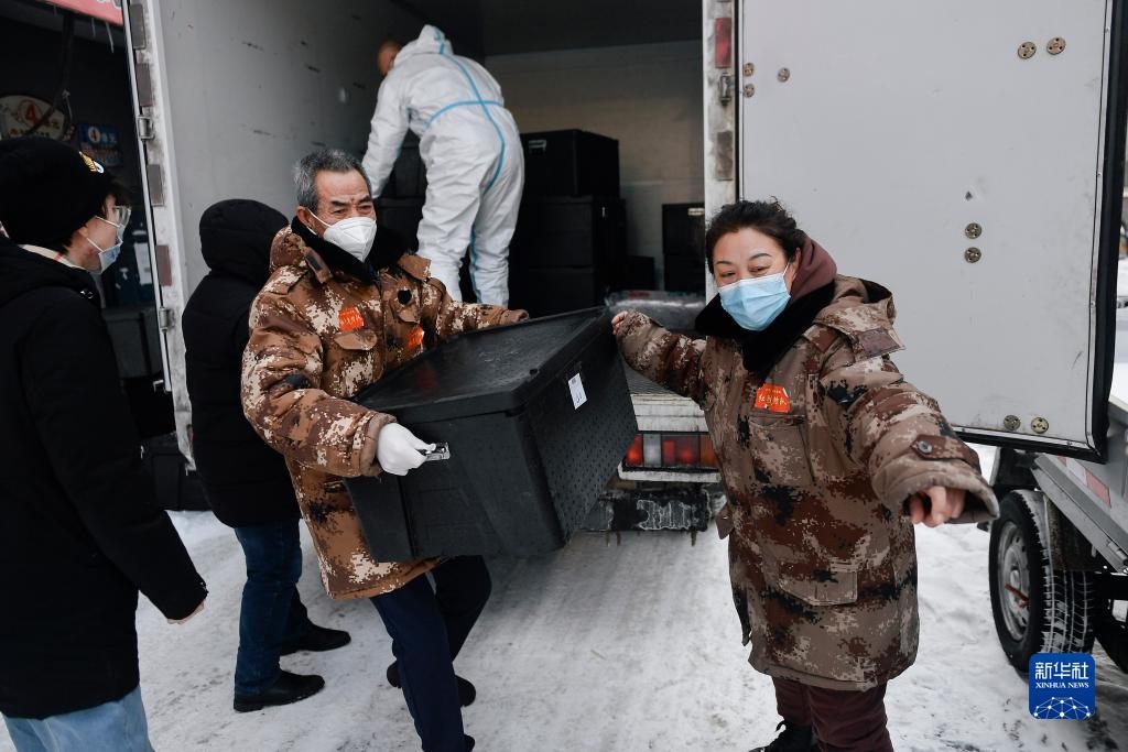 趙淑華(右一)指揮社區(qū)工作人員和志愿者搬運盒飯(2021年2月15日攝)。趙淑華是吉林省通化市東昌區(qū)團結(jié)街道文化社區(qū)副主任、網(wǎng)格長,臨近退休的她毫不猶豫投身抗疫一線。新華社記者 許暢 攝