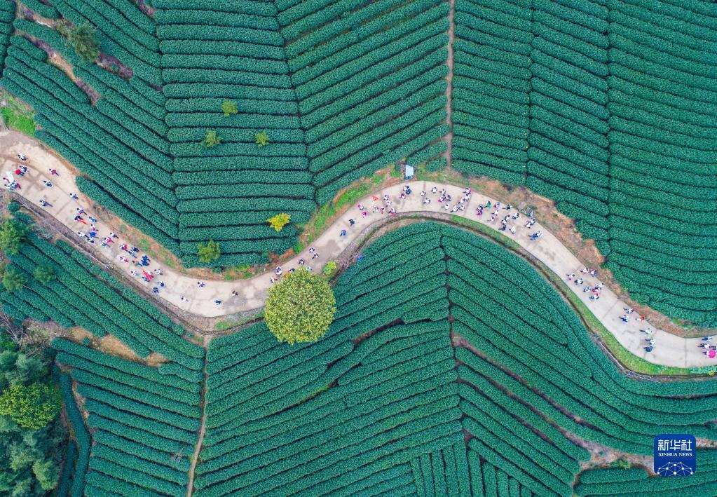 團隊游客在杭州市富陽區(qū)拔山村萬畝茶山游覽(2018年3月26日攝,無人機照片)。浙江省“千村示范、萬村整治”工程撬動了鄉(xiāng)村從美麗生態(tài)到美麗經(jīng)濟,再到美好生活的良性循環(huán)。2018年,浙江“千萬工程”獲得聯(lián)合國“地球衛(wèi)士獎”中的“激勵與行動獎”。新華社記者 徐昱 攝