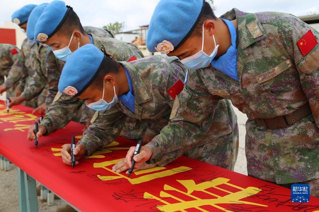 5月1日,在黎巴嫩南部提爾市沙馬村的中國維和營區(qū),中國第20批赴黎巴嫩維和建筑工兵分隊(duì)的官兵們?cè)跈M幅上簽字。新華社發(fā)(莊小好 攝)