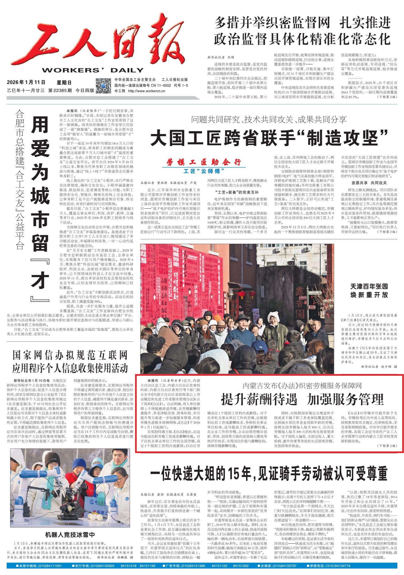 2026年1月11日,《工人日報(bào)》頭版刊發(fā)了《提升薪酬待遇 加強(qiáng)服務(wù)管理》的文章,報(bào)道了2026年1月1日起,內(nèi)蒙古7部門聯(lián)合施行省部級及以上勞模服務(wù)管理辦法,明確用人單位原則上不得隨意辭退勞模,從薪酬提升、退休榮譽(yù)津貼發(fā)放、困難補(bǔ)助、學(xué)歷提升支持、失業(yè)優(yōu)先再就業(yè)及住房優(yōu)先保障等方面強(qiáng)化服務(wù)保障,并建立屬地管理及違法違紀(jì)等情形的退出機(jī)制。