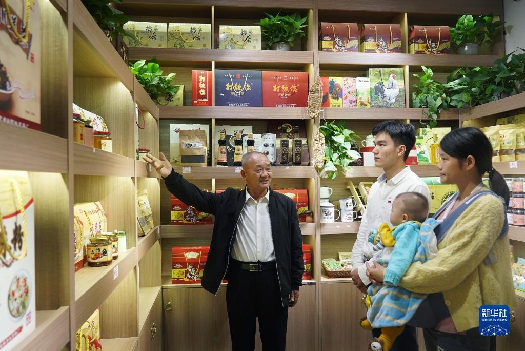 2020年10月21日,江西省贛州市于都縣梓山鎮(zhèn)潭頭村村民孫觀發(fā)(左一)向游客介紹當(dāng)?shù)氐奶厣r(nóng)產(chǎn)品。 新華社記者 萬(wàn)象 攝