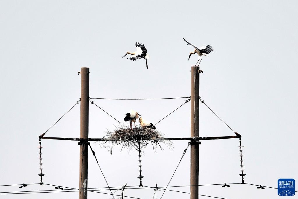 這是山東黃河三角洲國家級自然保護區(qū)電線桿上的東方白鸛的巢(2021年5月13日攝)。新華社記者郭緒雷攝