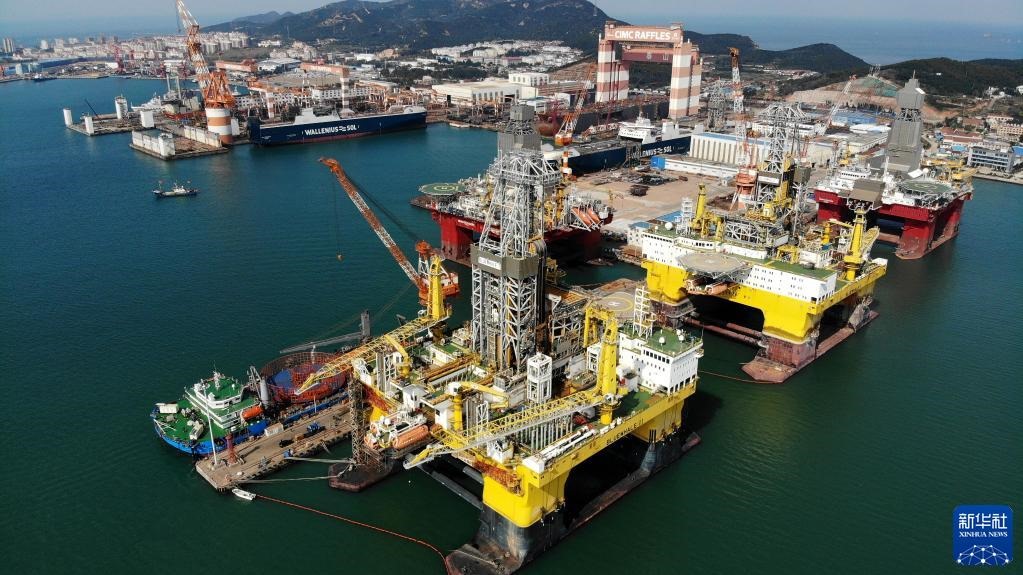 “藍鯨1號”(前右)及姊妹平臺“藍鯨2號”(前左)在其生產(chǎn)基地中集來福士海洋工程有限公司煙臺基地進行維護和保養(yǎng)(2021年10月18日攝,無人機照片)。新華社記者李紫恒攝