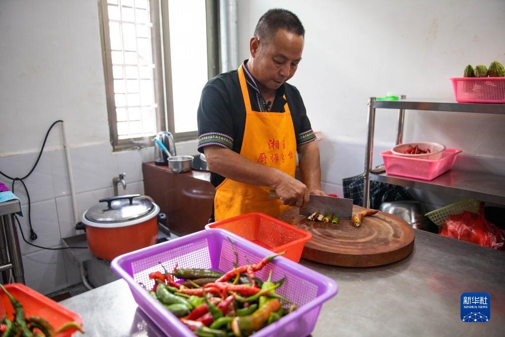 2020年9月17日,在汝城縣沙洲瑤族村,朱小紅在自家開的農(nóng)家樂廚房里切菜。新華社記者 陳思汗 攝